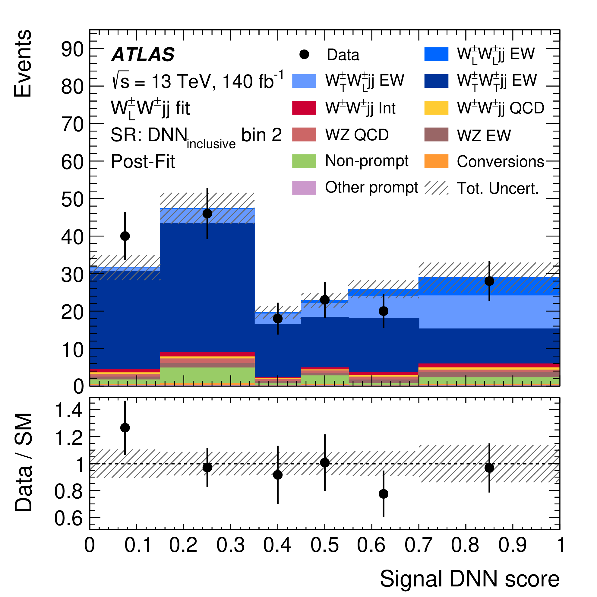 中国科大ATLAS实验团队近期利用质心系能量为13 TeV的质子-质子碰撞数据,在同电荷WW玻色子散射过程中(图1)首次观察到了纵向极化W玻色子的实验迹象,这是国际上首次在双玻色子散射过程中探测到纵向极化玻色子信号。为在复杂环境下的实验数据中区分大量本底事例与稀有信号,团队开发了基于深度神经网络的分类器,整合多个具有细微差别的动力学观测量,大幅提升信号与本底的区分度(图2);通过统计拟合得到纵向极化W玻色子信号的统计显著性达到3.3(标准差)水平。该成果为标准模型中的电弱作用规范结构提供了新的实验证据,也为未来在双玻色子散射中测量玻色子的极化开辟了新的途径。随着LHC的继续运行和未来的升级,科学家们将能收集更多数据、提高探测精度,或许终有一天能直接捕捉到这类稀有过程的信号,揭开更多宇宙奥秘。