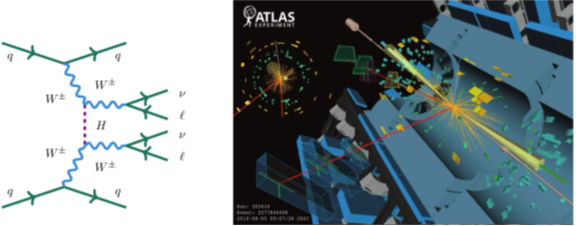 图1:(左)同电荷WW玻色子散射(ssWW)过程的典型费曼图,图中虚线代表希格斯玻色子;(右)ATLAS实验在13 TeV的质子-质子对撞中捕捉到的一个包含纵向极化W玻色子末态的ssWW散射过程,图中红色径迹代表重建出的从W玻色子衰变的缪子,黄色锥角代表重建出的强子喷注